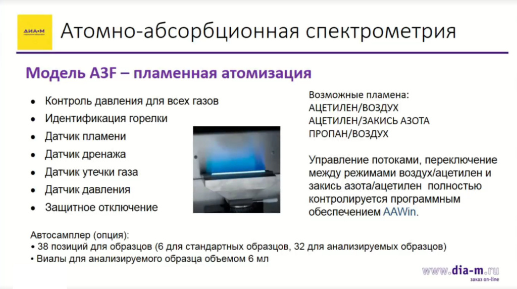 Особенности атомно-абсорбционного спектрометра Persee A3F с пламенной атомизацией в том, что прибор может работать на смесях ацетилен/воздух, ацетилен/закись азота и пропан-бутановой смеси с воздухом, что важно для труднодоступных регионов. Например, если в условиях тайги работают золотодобытчики, у них вряд ли будет доступ к ацетилену, но пропан-бутан им можно обеспечить.(Рис. 2)