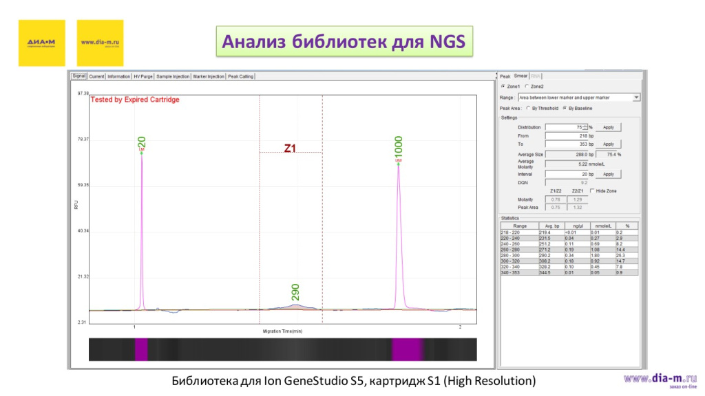 Один из примеров анализа библиотек NGS: так оценивали библиотеку перед секвенированием на секвенаторе ThermoFS Ion GeneStudio S5 System, используя картридж S1. Задан интервал в 20 пар нуклеотидов: таблица показывает примерную концентрацию в каждом диапазоне. Видно, что максимум приходится на 290 нуклеотидов с концентрацией 0.34 нг/мкл. (Рис. 3)
