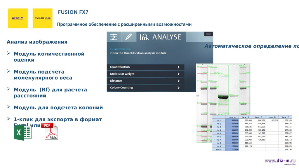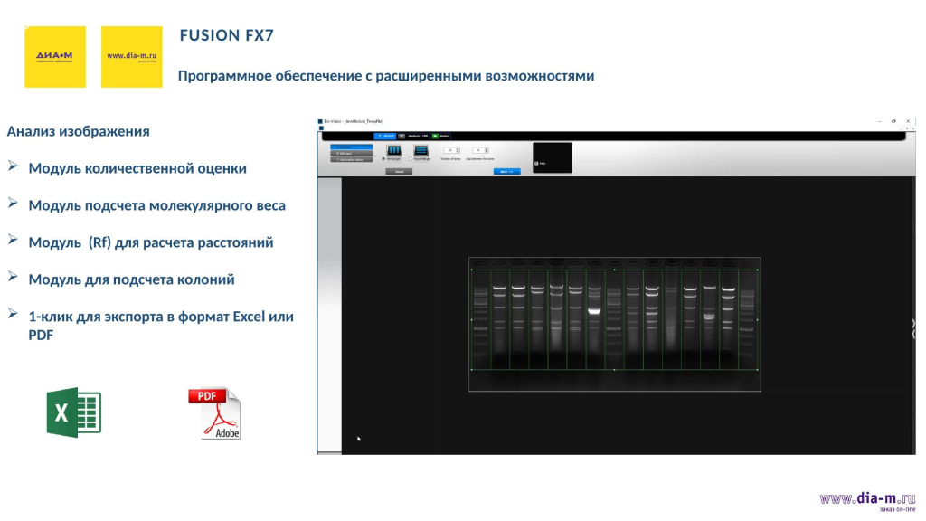 Для анализа изображений в этом ПО есть модуль количественной оценки, а также модуль подсчета молекулярного веса. При рассмотрении образцов в чашках Петри можно считать колонии, то есть использовать систему как счетчик колоний — соответствующий модуль тоже есть в ПО.