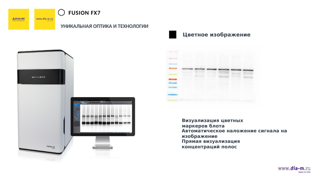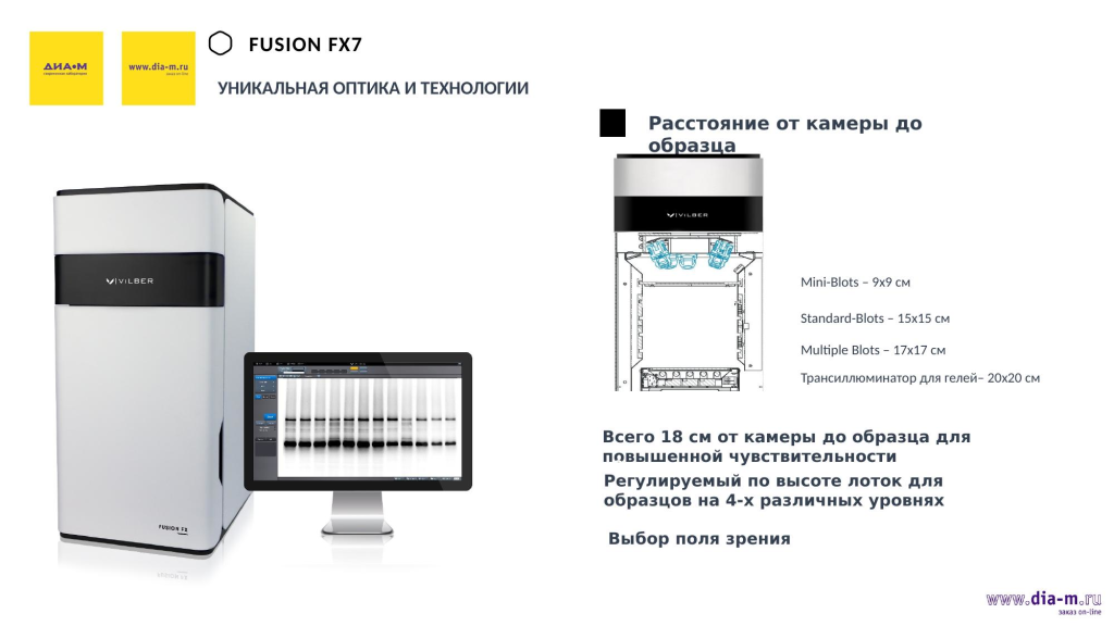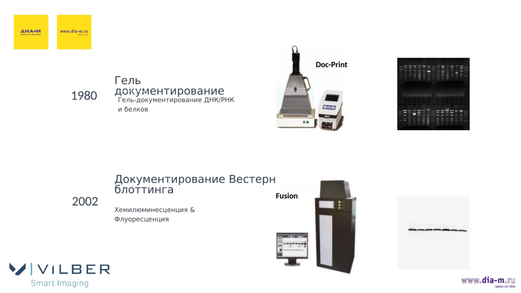 Компания Vilber расположена во Франции, завод находится непосредственно под Парижем. Региональные офисы Vilber есть еще в Китае и Германии. У компании более100 представительств в странах мира, в том числе в России, где эксклюзивным представителем стала «Диаэм», а также более 20 оснащенных лабораторий по всему миру — то есть Vilber — это глобальный игрок на мировом рынке.