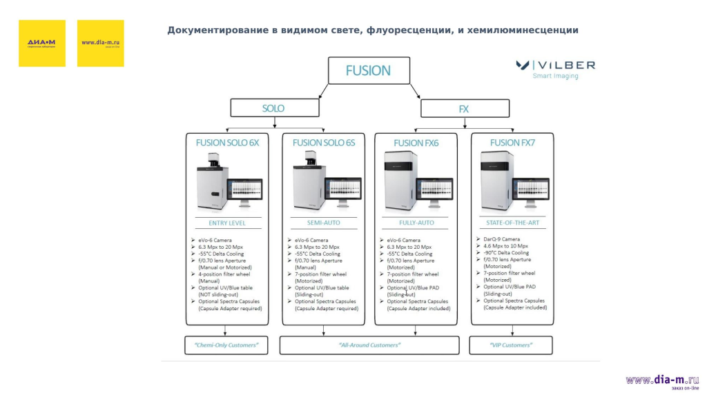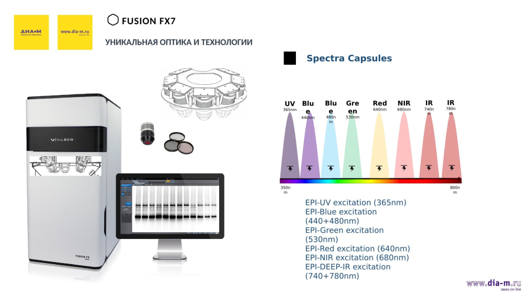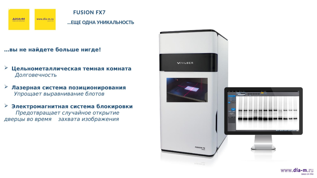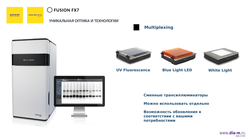 Сложностей в поставках на момент доклада нет: «Диаэм» и Vilber — давние партнеры, причем «Диаэм» — эксклюзивный представитель Vilber в России. У французского производителя были определенные сложности с поставками оптики из Японии, но это в прошлом. А у «Диаэм» на складе есть системы E-box, есть Quantum, который подключается к компьютеру, и Fusion FX6 и Fusion FX7 скоро поступят.
