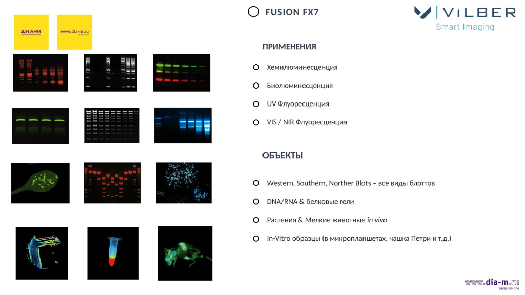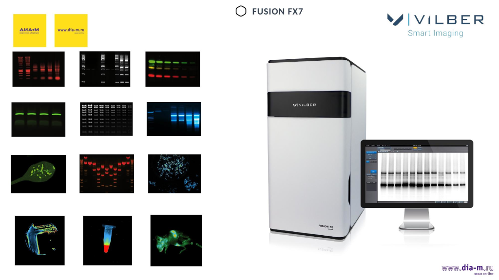 С тех времен модельный ряд изменился. Здесь представлена система Fusion FX7, а слева — изображения образцов, которые были получены — не только гелей, но и мелких животных, растений, объектов в пробирках, чашках Петри, на чипах и т. д.