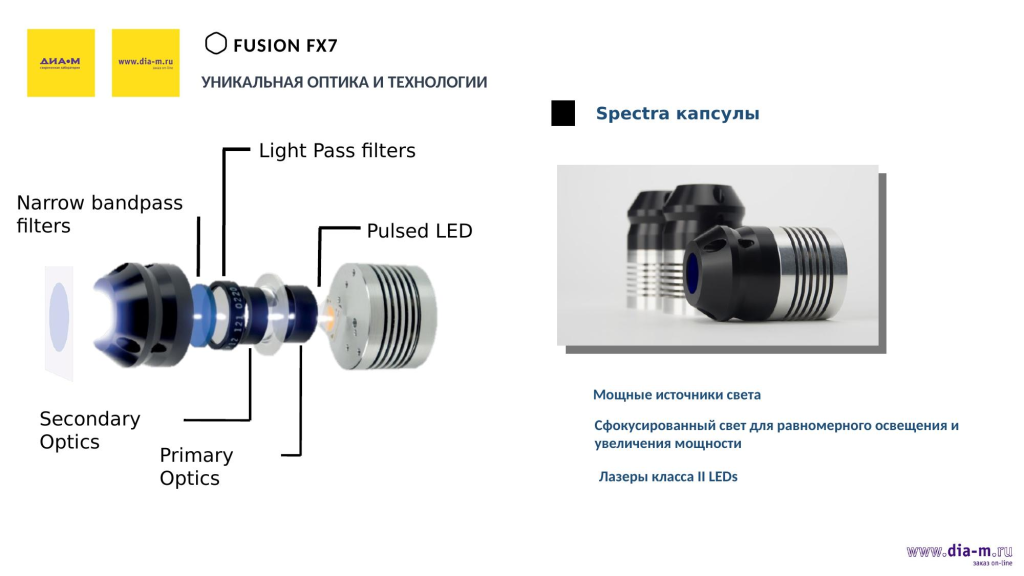 Система может быть оснащена спектр-капсулами — мощными источниками света, сфокусированного для равномерного освещения и высокой мощности. В них используются высококлассные лазеры — соответственно, эти спектр-капсулы позволяют дооснастить систему восемью источниками света в диапазоне от УФ до ИК.
