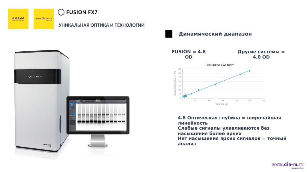 Также важен динамический диапазон. У систем Fusion этот параметр составляет 4,8 — это оптическая глубина, которая позволяет получать широчайшую линейность. При этом слабые сигналы усиливаются без насыщения более ярких, как результат — линейная зависимость без перенасыщения более ярких сигналов, что позволяет сделать анализ более точным.