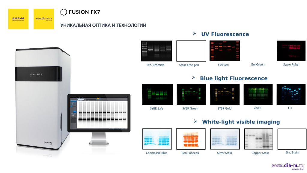 Здесь приведены примеры изображений, которые получены с разными красителями в УФ флуоресценции, в синем свете; мы можем видеть использование красителей SYBR иколориметрические красители с использованием белого видимого света.