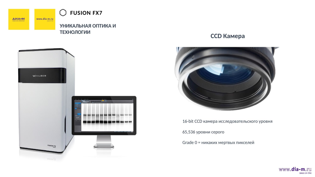 В приборе Fusion FX7 представлена 16-битная CCD камера исследовательского уровня, которая позволяет без каких-либо «мертвых» пикселей получать изображения с 65 тысячами уровней серого.