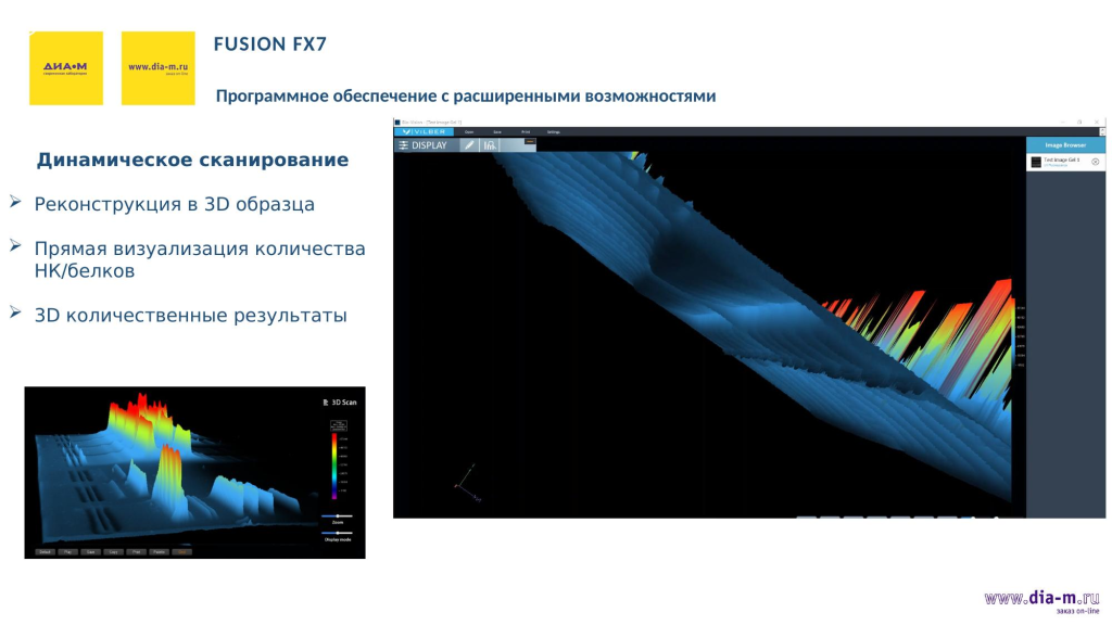 Кроме того, программное обеспечение позволяет реконструировать полученное изображение в 3D, чтобы на пиках оценить насыщенность, концентрацию: по пикам можно понять, где больше и где меньше вещества. Так получается прямая визуализация количества и возможно получение количественных результатов.