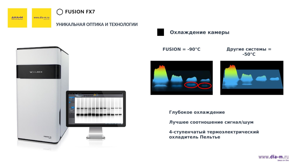 На слайде приведены примеры результатов, полученных с использованием системы, которая охлаждает на «-50 градусов» от комнатной температуры, и с помощью системы Fusion FX7, для которой этот параметр заявлен как «-90 градусов». Такое глубокое охлаждение позволяет зафиксировать сигналы в образцах с концентрацией до одного пикограмма: на иллюстрации красным выделены две полосы (сигналы белков), которые можно потерять в случае недостаточно глубокого охлаждения.