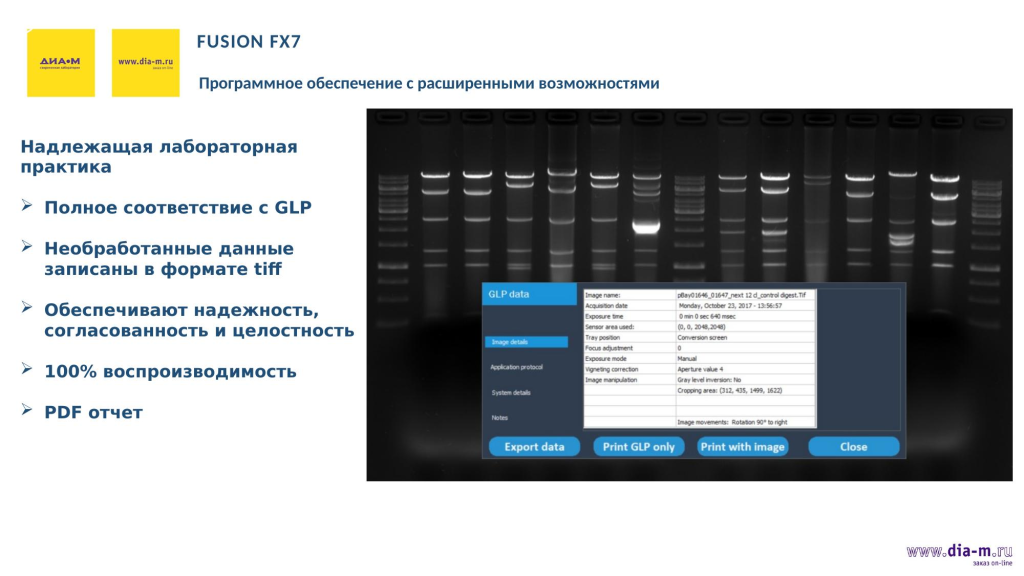 Запись необработанных данных в формате tiff (*.tif) оказалась крайне важным моментом в случае необходимости показать, что определенное изображение было получено именно таким, а не представляет собой результат какого-либо редактирования. Соответственно, и отчет GLP можно получить в формате PDF, если есть необходимость. Так что Fusion — этовсегда надежность и согласованность, а также стандартизация исследовательских процессов.