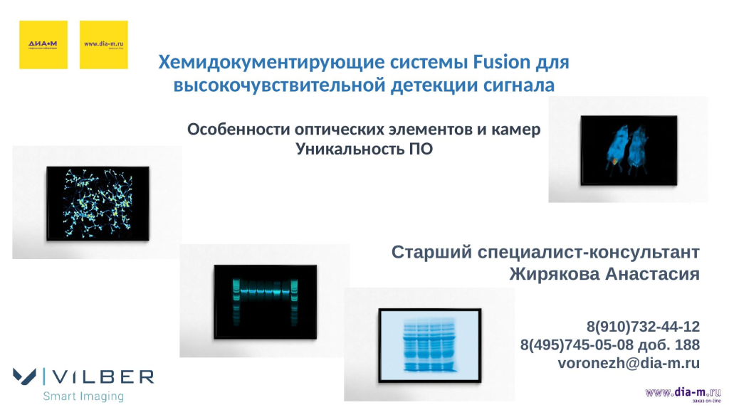 Продакт-менеджер «Диаэм» по направлению «Системы визуализации», специалист по продукции компании Vilber Анастасия Жирякова рассказала о хемидокументирующих системах Fusion для детекции хемилюминесценции, флуоресценции, биолюминесценции для получения изображений.