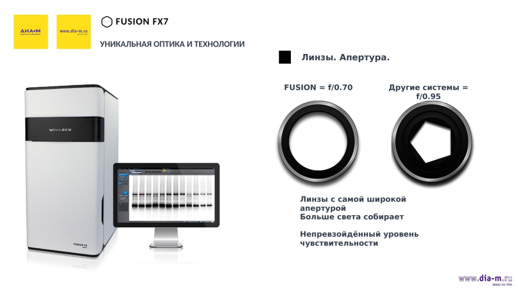 Вместо этого в системах Vilber используются линзы с самой широкой апертурой f/0,7 — значением, которое не удалось превзойти другим производителям. Понятно, что при значении апертуры f/0,95 просвет линзы меньше: чем больше апертура, тем больше линза собирает света, тем более чувствительным получается изображение без каких-либо оптических аберраций.