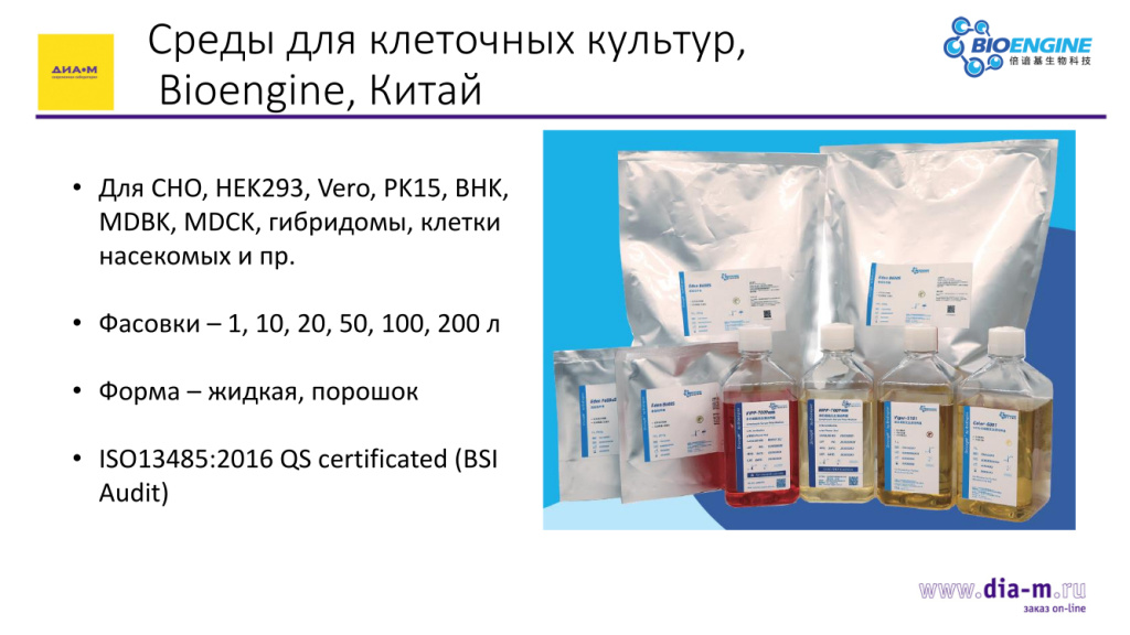 «Диаэм» предлагаем такой продукт, произведенный компанией Bioengine (Китай) в различных объемах (1, 10, 20, 50, 100 и 200 л) в порошке и в жидком варианте. Доступны среды не только для биотехнологических процессов, но и для клеточной терапии.