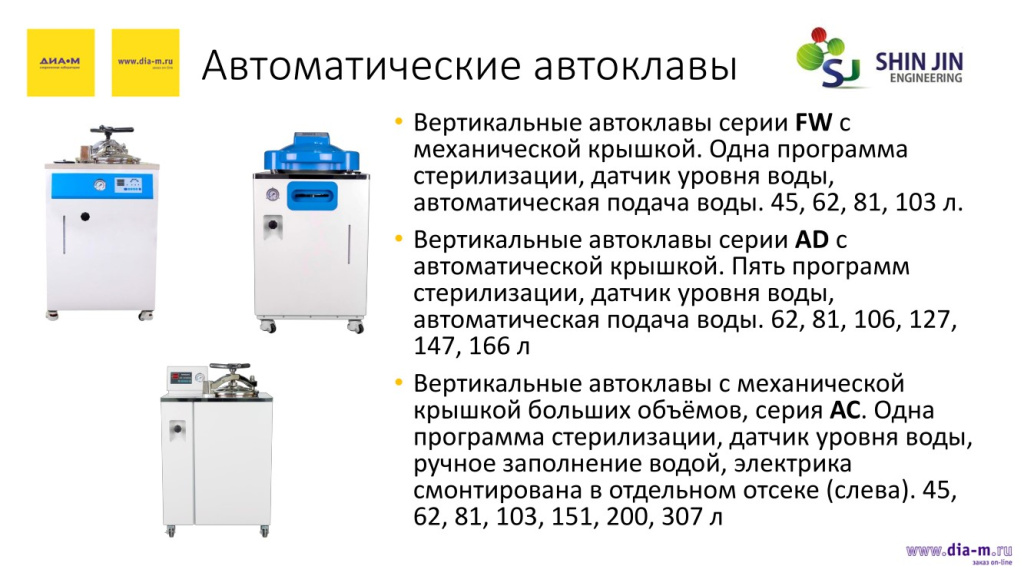 Наш ассортимент пополнен корейскими автоматическими автоклавами Shin Jin Engineering (SJ). В наличии есть пять линеек: здесь представлены вертикальные автоклавы самой простой серии FW с механической крышкой (одна программа стерилизации, датчик уровня воды и автоматическая подача воды) объемами 45, 62, 81 и 103 л. Есть серия AD с автоматической крышкой (пять программ стерилизации, датчик уровня воды, автоматическая подача воды) объемами от 62, 81, 106, 127, 147 и 166 л.