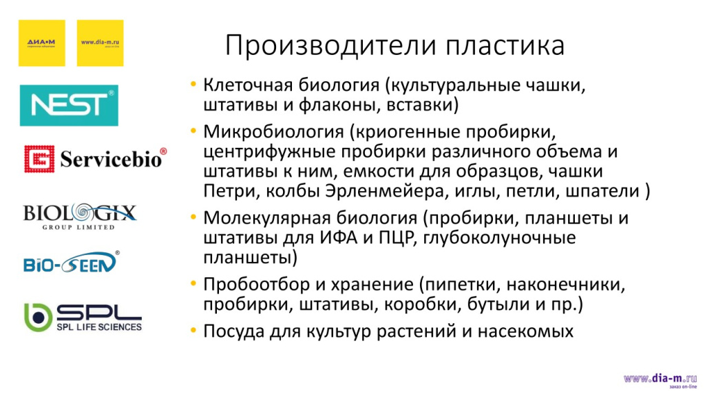 На слайде представлено разнообразие пластиковой посуды, которая требуется в лаборатории и без которой, как правило, невозможно произвести никакие манипуляции, идет ли речь о микробиологическом эксперименте, выделении и дальнейшей работе с ДНК, РНК и белками, ИФА, хранении реактивов или чем-либо еще.