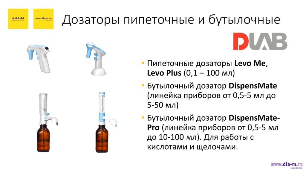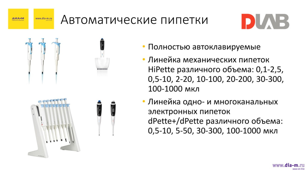 У «Диаэм» появились пипетки китайского производителя DLab (это бывший Dragonlab). Они представлены линейками механических пипеток HiPette объемами 0.1-2.5, 0.5-10, 2-20, 10-100, 20-200, 30-300, 100-1000 мкл и электронных dPette+/dPette объемами 0.5-10, 5-50, 30-300, 100-1000 мкл.