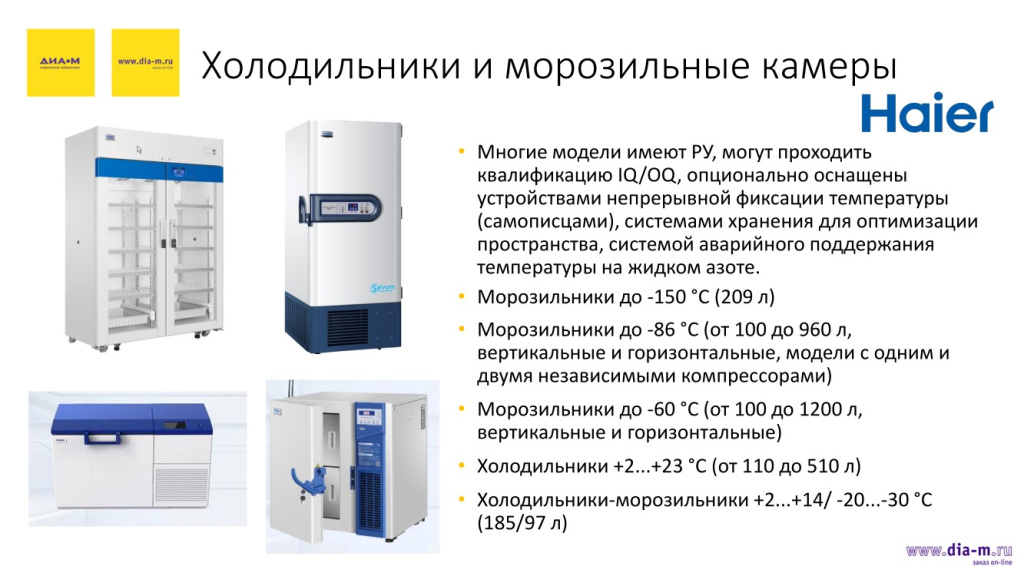 Значительная часть продукции Haier имеет регистрационные удостоверения, могут проходить квалификацию IQ/OQ и могут оснащаться устройствами фиксации температуры (самописцами), устройствами аварийного поддержания температуры на жидком азоте и другими полезными опциями.