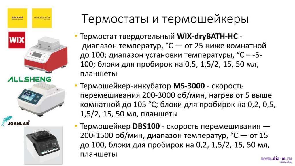 «Диаэм» предлагает продукцию трех производителей термостатов и термошейкеров – китайских WIX, Allsheng и Joanlab. Все это вполне современные эргономичные удобные приборы – полные аналоги того же Eppendorf, например, ThermoStat C или ThermoMixer F1.5. Они немного отличаются по дизайну, имеют все необходимые термоблоки, есть различия по температуре: с охлаждением и без охлаждения, у Allsheng предусмотрена повышенная скорость – до 3000 оборотов в минуту.