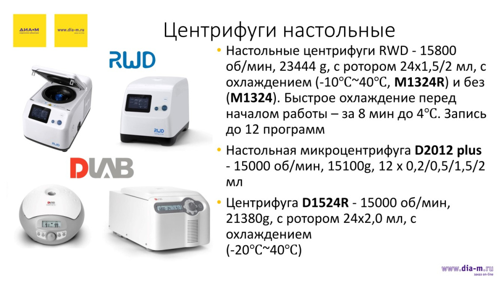 «Диаэм» предлагает настольные центрифуги DLab. Например, D2012 Plus (слева) – это полный аналог MiniSpin от Eppendorf: 15000 об/мин, 15100 g, 12х0.2/0.5/1.5/2 мл. Справа на слайде представлена настольная центрифуга D1524R с охлаждением: 15000 об/мин, 21380 g, ротор 24х20 мл, охлаждение в диапазоне от -20 ºС до 40 ºС.