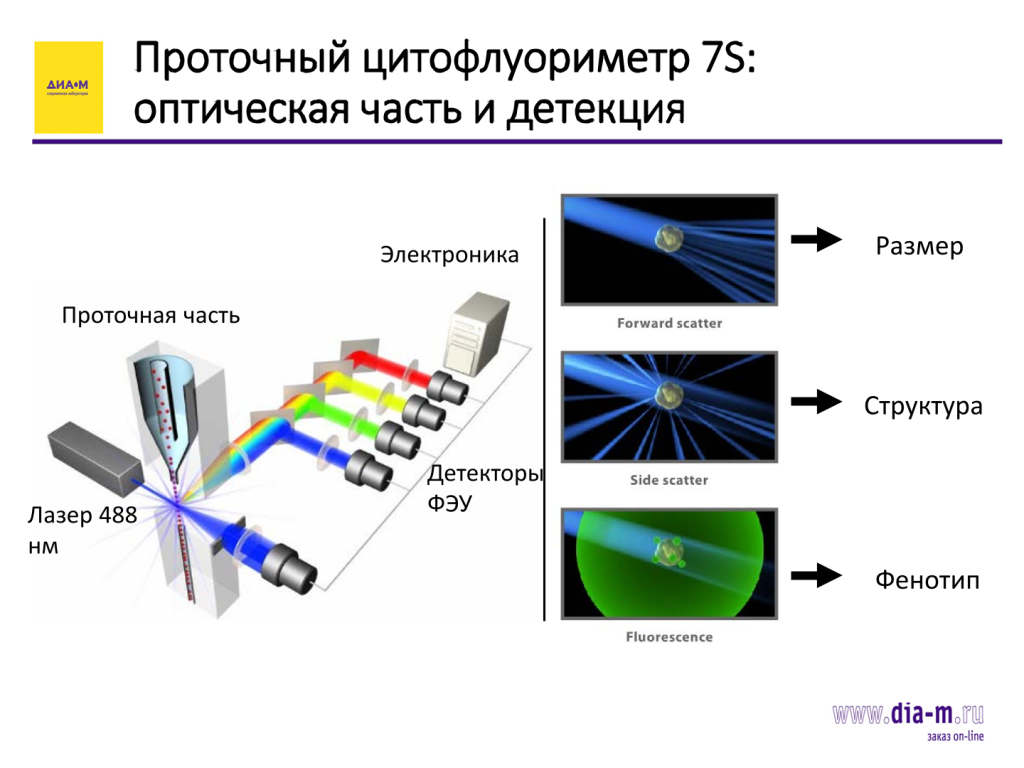 В приборе присутствуют всего один лазер с длиной волны 488 нм, набор дихроических зеркал и набор детекторов с детекцией по прямому и боковому светорассеянию, а также пять флуоресцентных детекторов (на схеме показано три, по факту пять).