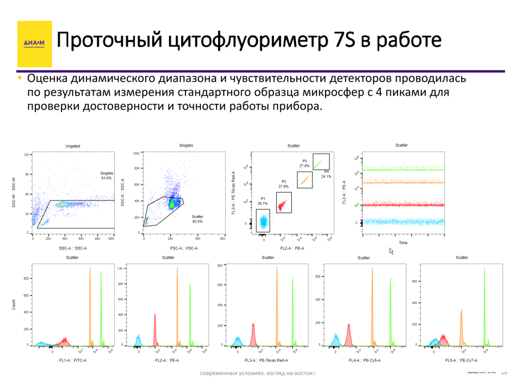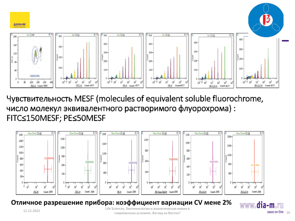 Что касается чувствительности: на слайде приведены данные гистограммы по детекции молекулярных эквивалентов растворимого флуорохрома — по FITC и по фикоэритрину с анализом коэффициентов вариации по каналам — в принципе показатели, заявляемые производителем, довольно хорошие.