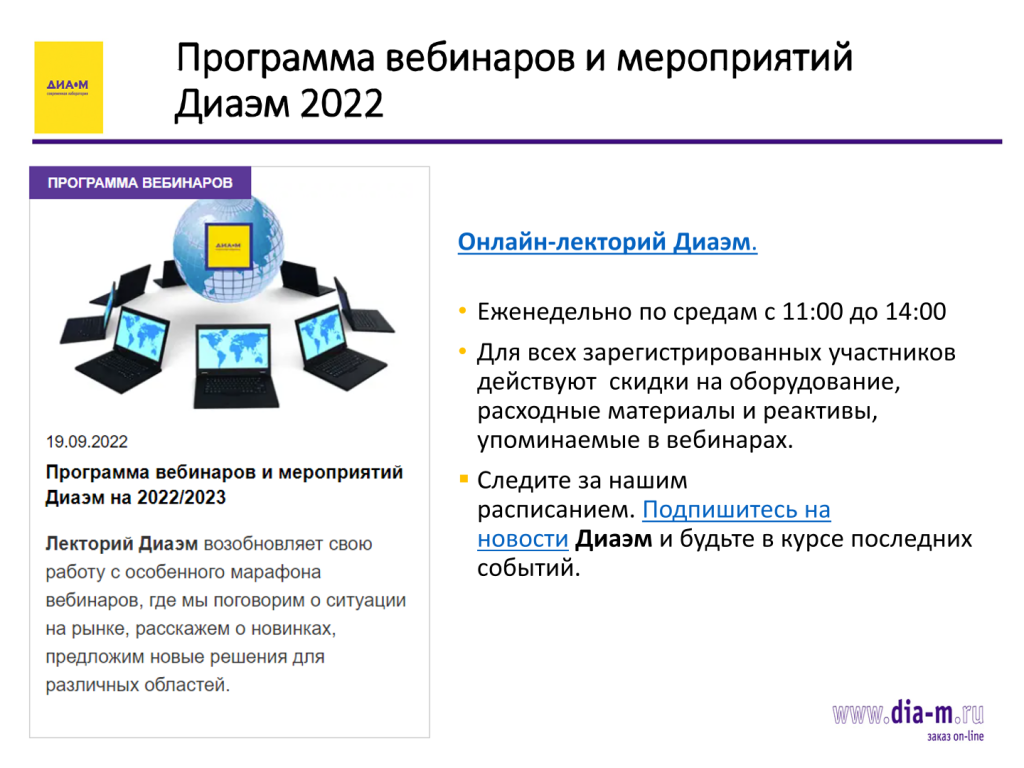 Кроме того, следует отметить программу лектория «Диаэм», на сессиях которого специалисты знакомят пользователей с полезной информацией о продукции и ее применении.