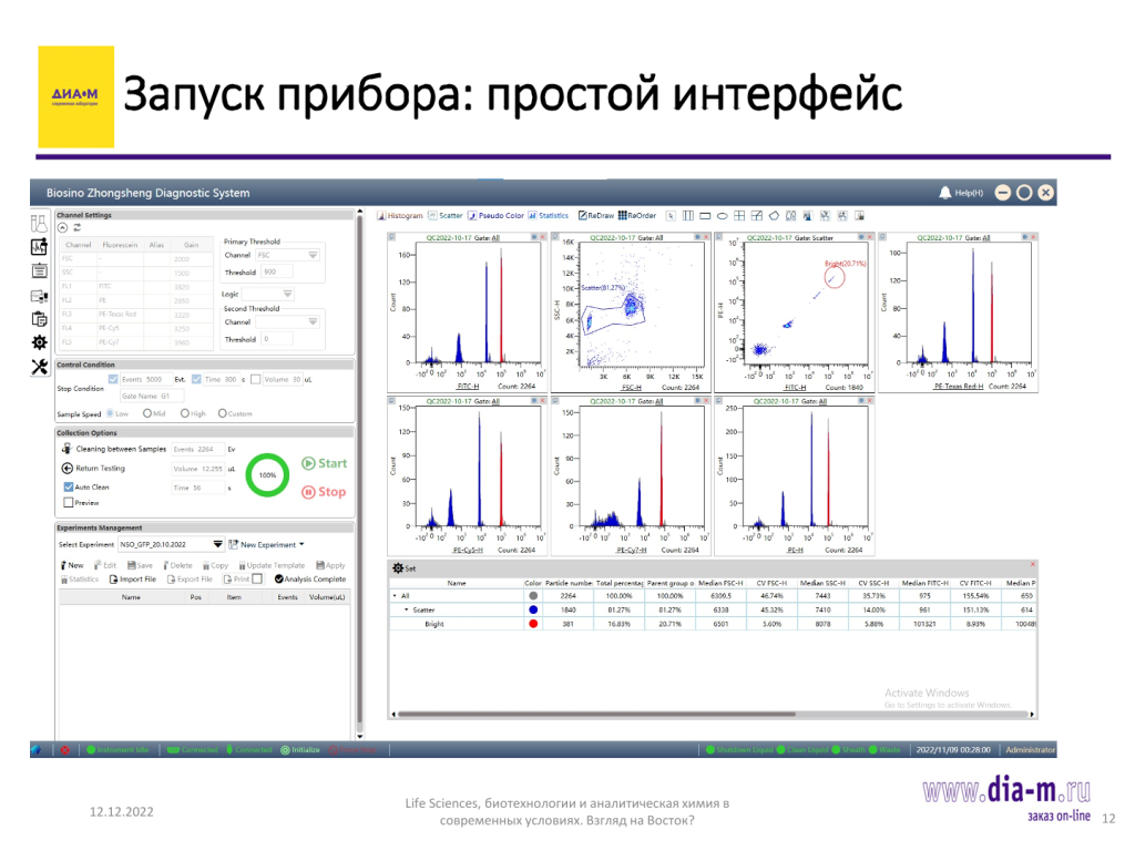 Чувствительность довольно неплохая для прибора своего класса: FITC ≤150 MESF, PE ≤50 MESF, FSC чувствительность менее 1 мкм, при этом коэффициент вариации (CV) для всех каналов составляет менее 2%, что говорит о неплохой чувствительности.