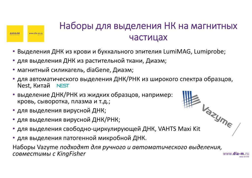 Представлен широкий ассортимент наборов DiaGene и Vazyme, доступных в комплектации «мини», «миди» и «макси». Наборы для выделения НК на магнитных частицах