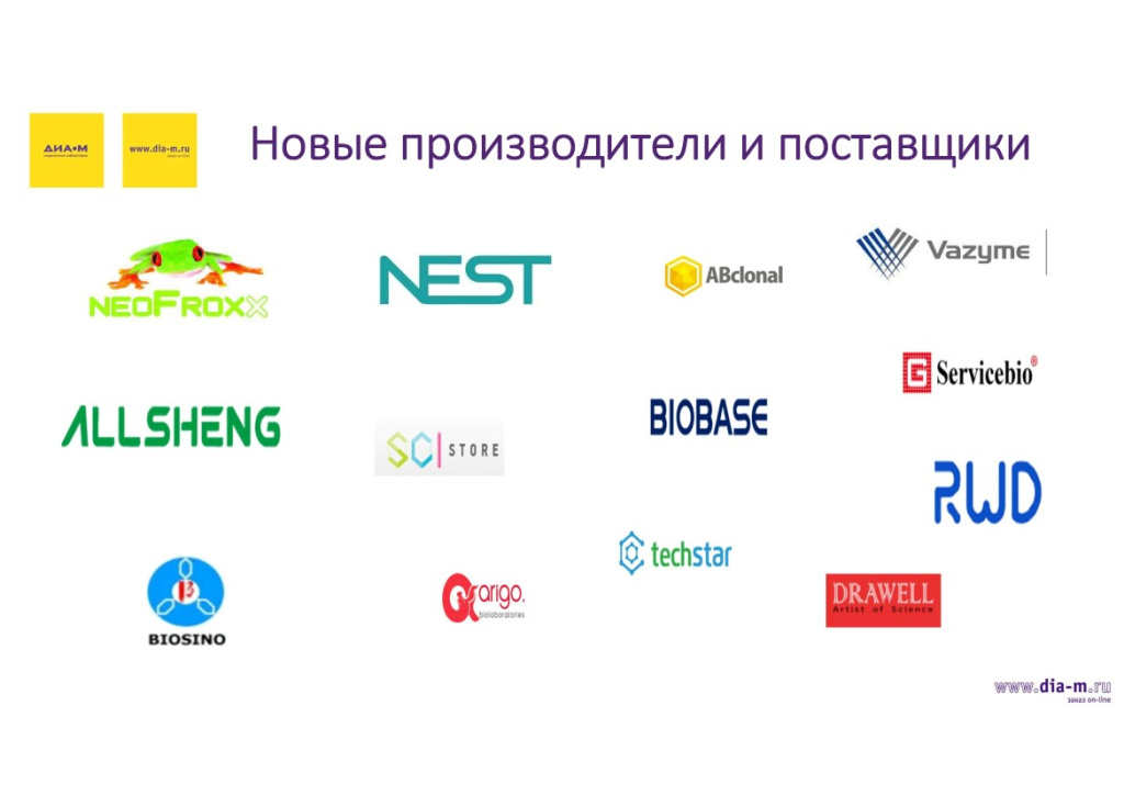В настоящее время «Диаэм» по-прежнему продолжает поставлять продукцию знакомых пользователям западных производителей: на слайде приведены логотипы лишь некоторых из них, например, New England Biolabs, ThermoFisher Scientific, Abcam, Binder, Vilber, PHCbi, Bio-Rad, MP Biomedicals, Sigma-Aldrich. Все они продолжают работать на территории России.