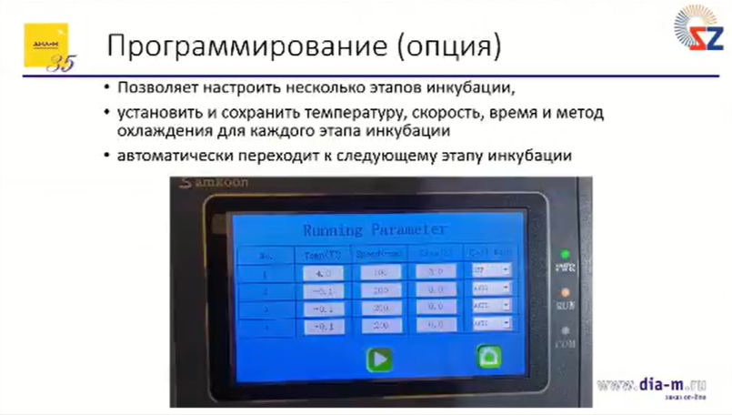 Программирование шейкера-инкубатора позволяет настроить несколько этапов инкубации, установить и сохранить температуру, скорость, продолжительность и метод охлаждения для каждого этапа, автоматически перейти к следующему этапу инкубации.