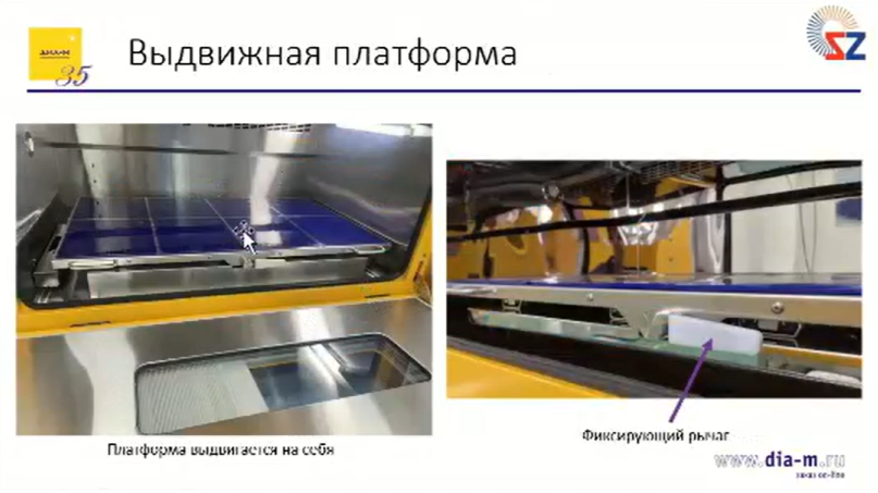 На слайде видно ручки, за которые можно потянуть и выдвинуть платформу, а также фиксирующий рычаг, который нужно повернуть влево, чтобы выкатить платформу, а после того, как закатили ее на место — повернуть вправо для фиксации.
