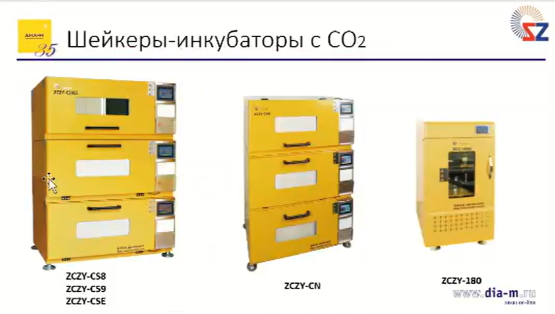 Линейка шейкеров-инкубаторов с контролем содержания углекислого газа (от 0 до 20 %) предназначена для работы с клеточными культурами — выращивания клеток млекопитающих в колбах. Такие приборы есть разного размера: ZCZY-CS8, ZCZY-CS9, ZCZY-CSE, ZCZY-CN, ZCZY-180 и т.д.