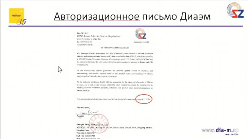 Наконец, мы располагаем скриншотом авторизационного письма, подтверждающего, что «Диаэм» является официальным дистрибьютором продукции Zhichu до августа 2024 года.