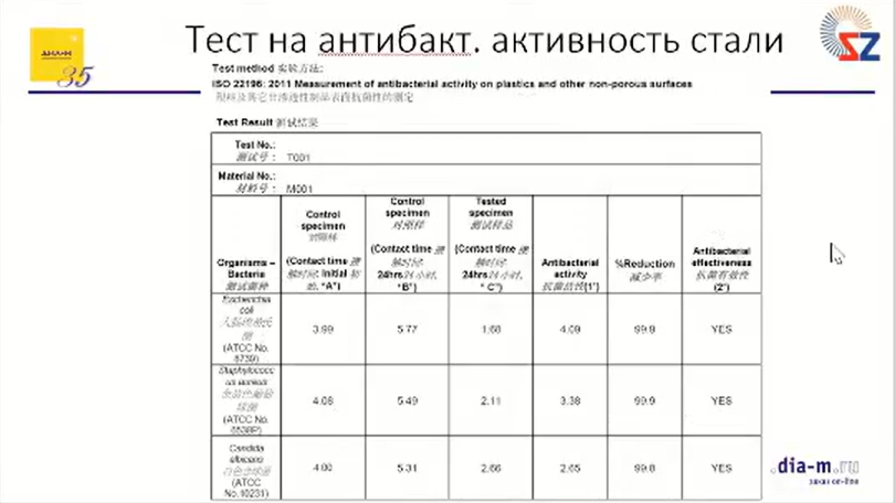 Представленный фрагмент сертификата о тестировании поверхности стали на антибактериальную активность показывает: при посеве разных видов микроорганизмов на исследуемый образец стали отмечена эффективность сдерживания роста на уровне, который составляет обычно 99,9 %. У «Диаэм» есть полный сертификат, он будет предоставлен пользователям, которым это интересно.
