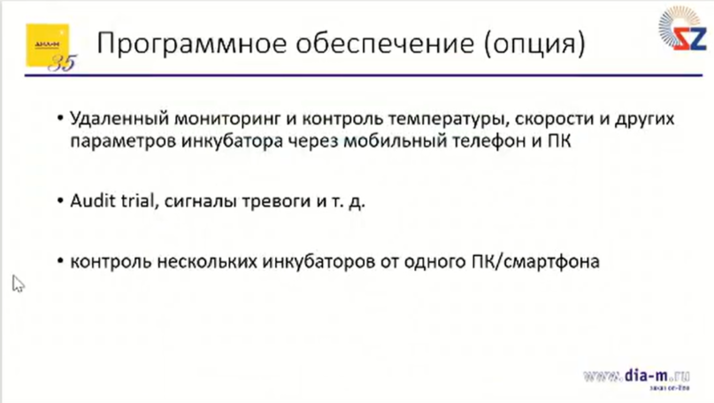 Доступны также такие функции в программном обеспечении как удаленный мониторинг и контроль температуры, скорости и других параметров инкубатора со смартфона, ноутбука или стационарного компьютера. При этом с одного устройства (смартфона или компьютера) можно одновременно контролировать несколько инкубаторов.