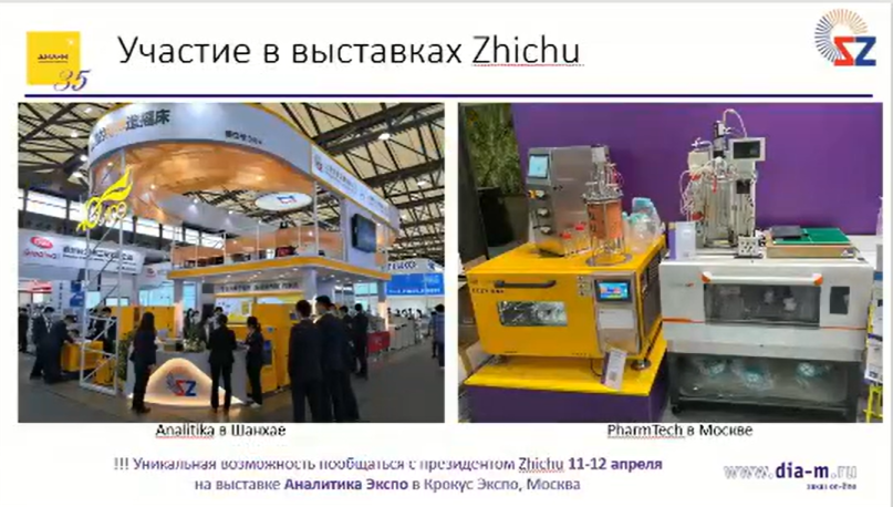 Представители Zhichu принимают участие в различных выставках со своей продукцией: так, слева на слайде изображен стенд компании на выставке «Аналитика» в Шанхае, справа — на «Фармтехе» в Москве, где компания «Диаэм» представляла шейкеры-инкубаторы этого производителя. Посетителям представилась уникальная возможность пообщаться с президентом компании Zhichu.