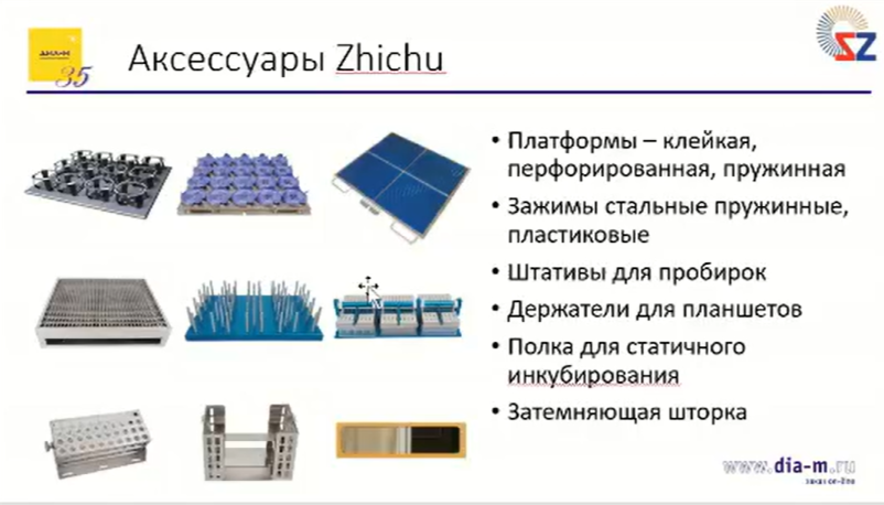 Как и в случае шейкеров-инкубаторов, произведенных европейскими компаниями, Zhichu предлагает в качестве аксессуаров стальные и пластиковые зажимы, клейкую платформу, а также различные держатели для планшетов, штативы для пробирок, полку для статичного инкубирования.