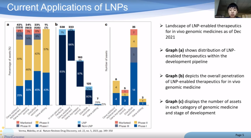 Следующие диаграммы отображают обзор лекарств на основе наночастиц для in vivo геномных препаратов по состоянию на декабрь 2021 года. Колонка А1 показывает долю препаратов на основе ЛНЧ, вышедших на конвейер и рынок. Видно, что даже к концу декабря 2021 это очень маленький процент продаваемых на рынке терапевтических препаратов, в то время как большинство таких препаратов находится на более ранних стадиях разработки и тестирования (фазы I–III исследований).