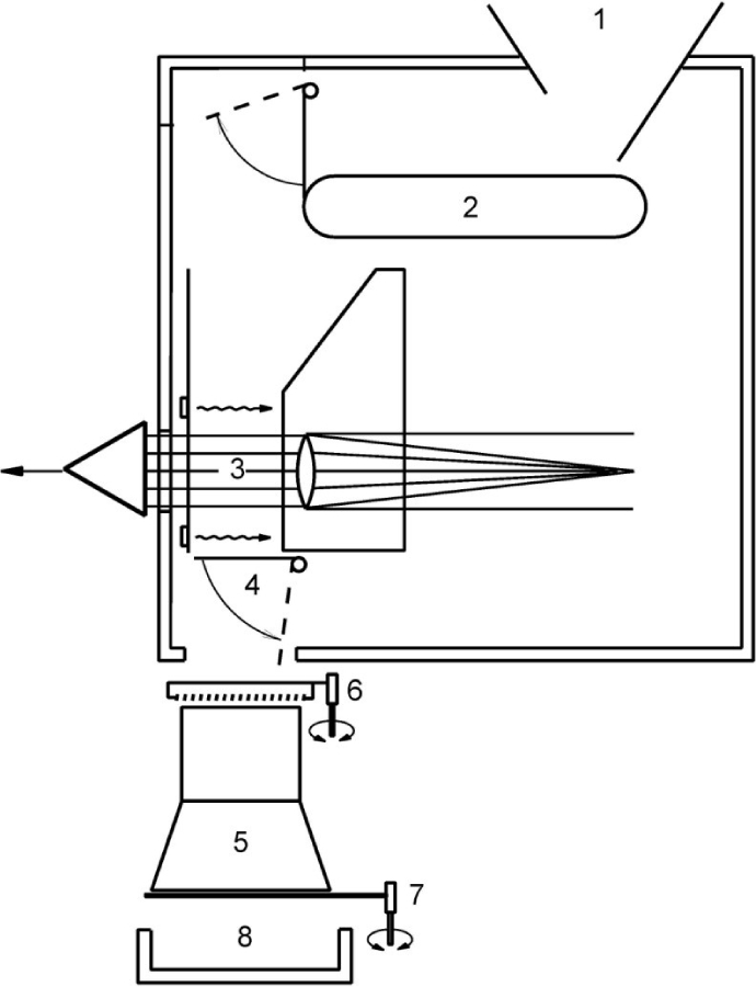 • После этого створка (7) в нижней части испытательной ячейки открывается, и зерно высыпается в ящик для приема образца (8).