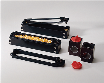 Сменная кювета толщиной 25 мм, предназначена для корректного измерения параметров зерна сои в приборе Inframatic 8800. Через кювету просыпается образец зерна (400 мл) и методом пропускания (transmission) ИК-света через этот поток зерна определяется содержание влаги, белка и масла в анализируемой сое.