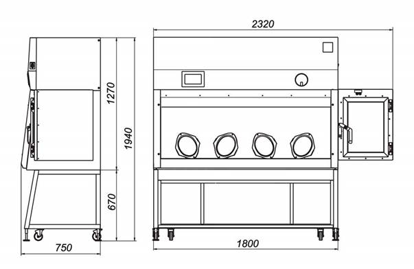 • окно оснащено двумя овальными перчаточными портами; на портах предусмотрены зацепления для установки автономного модуля проверки целостности перчаток (не входит в комплект поставки, поставляется в качестве опции;