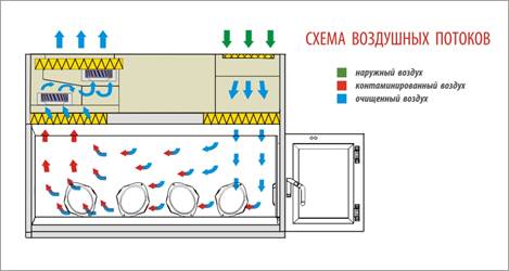 • очистка воздуха, поступающего в рабочую камеру, двухступенчатая: происходит через предварительный фильтр грубой очистки G4 и приточный НЕРА-фильтр Н14, расположенный над рабочей камерой;