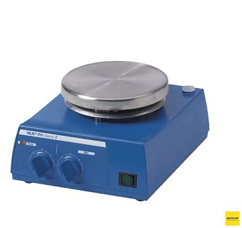 Магнитные мешалки с нагревом RH basic 2 нагревают до 320 °C и перемешивают до 10 л жидкости на платформе из нержавеющей стали диаметром 125 мм со скоростью 100-2000 об/мин.