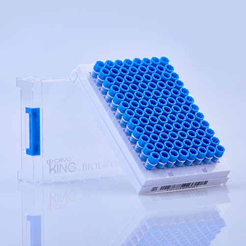 Криопробирки 0,75 мл, SBS формат, синие крышки, ПП, штрих-код на дне пробирок, штрих-код на дне штативов, конические, с юбкой, стерильные, бесцветные, 96 шт./штат., 10 штат./уп., 2 уп./кор., Biologix, Китай