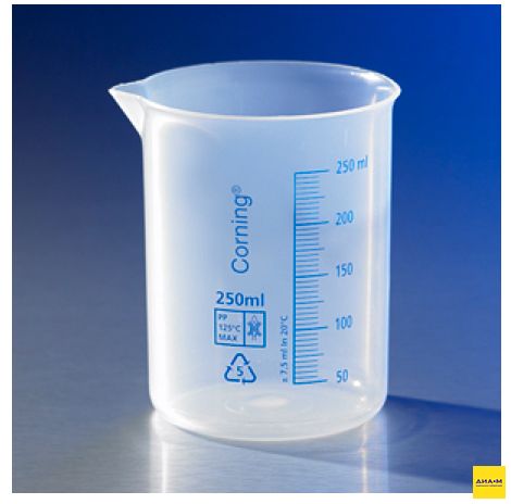Стаканы Corning из полипропилена с синей градуировкой, полупрозрачные, низкие, с носиком.