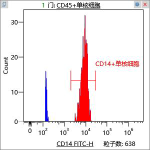Гистограмма CD14- FITC+. Клетки гейтирование по CD45PE-Cy5, экспрессируют CD14- FITC+, что показано на гистограмме
