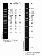 Маркер молекулярного веса ДНК GeneRuler 50bp содержит 13 фрагментов от 50 до 1000 п.н.; фрагменты: 50, 100, 150, 200, 250, 300, 400, 500, 600, 700, 800, 900, 1000 п.н.; имеет эталонные полосы (повышенной концентрации) при 250 и 500 п.н., что облегчает идентификацию в геле; предварительно смешан с буфером для нанесения; рекомендуемый объём для нанесения на гель — 1 мкл; условия хранения: при комнатной температуре или при 4 °С до 6 месяцев, более длительное хранение при -20 °C.