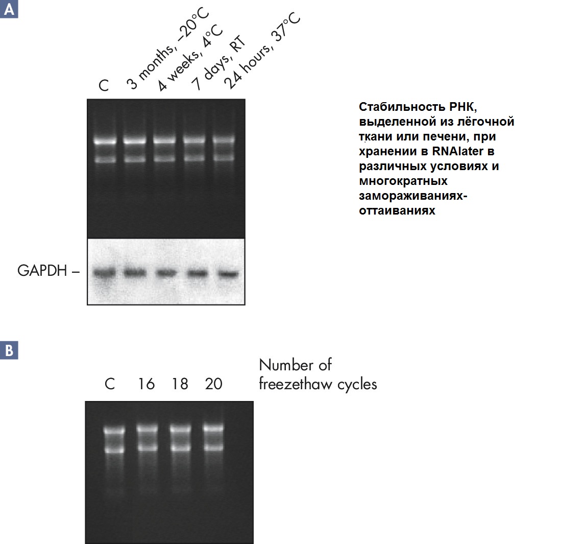 RNAlater образцы могут храниться до 1 суток при +37, до 7 суток при комнатной температуре, до 4 недель при +2-8 °С или неограниченно при -20 или -80 °С.
