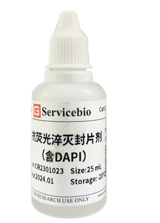Монтирующая среда с защитой от выцветания флуоресценции — это готовый водный реагент для фиксации микропрепаратов, предназначенный для одновременного окрашивания ядер и сохранения флуоресцентного сигнала в клетках и тканях. DAPI— это проникающий сквозь мембрану сине-флуоресцентный краситель, который избирательно связывается с двухцепочечной ДНК, после связывания интенсивность флуоресценции возрастает более чем в 20 раз, при этом краситель не взаимодействует с одноцепочечной ДНК. Экспозиционные максимумы: возбуждение — 364 нм, эмиссия — 454 нм (в комплексе с ДНК).