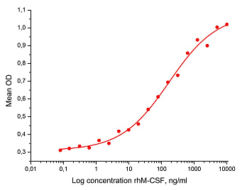 Рекомбинантный белок rhM-CSF человека стимулирует пролиферацию клеток линии лимфобластного миелолейкоза мышей (m-NFS-60). ED50 рекомбинантного белка rhM-CSF для данного эффекта обычно 40-90 нг/мл. Оптимальная концентрация для индивидуального применения определятся пользователем.