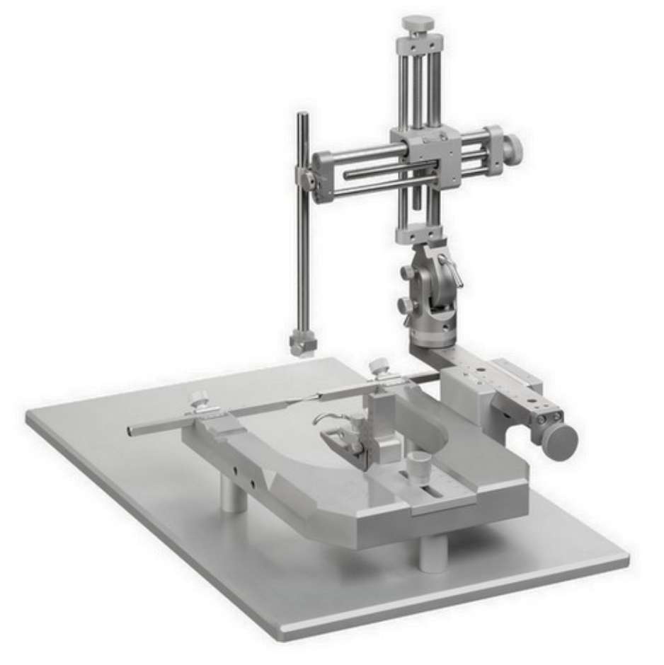 Оборудование для стереотаксиса позволяет зафиксировать голову животного в трех точках (рот, нос, уши) и обеспечить ее неподвижность с помощью специальной рамки.